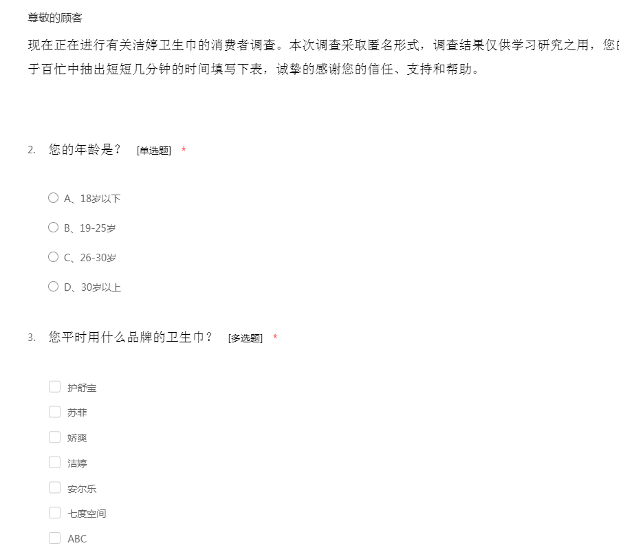 现在正在进行有关洁婷卫生巾的消费者调查。本次调查采取匿名形式,调查结果仅供学习研究之用,您的信息绝不会被透露。希望您于百忙中抽出短短几分钟的时间填写下表,诚挚的感谢您的信任、支持和帮助。