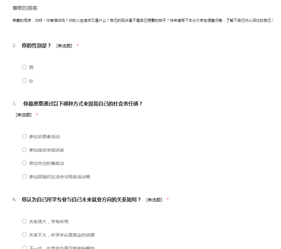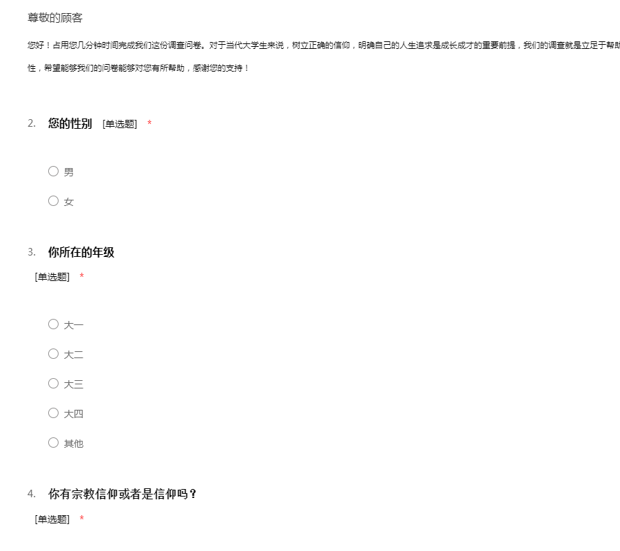 您好!占用您几分钟时间完成我们这份调查问卷。对于当代大学生来说,树立正确的信仰,明确自己的人生追求是成长成才的重要前提,我们的调查就是立足于帮助大学生明确树立正确信仰,找到人生追求的重要性,希望能够我们的问卷能够对您有所帮助,感谢您的支持!