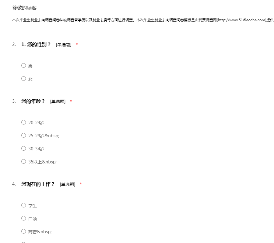 本次毕业生就业去向调查问卷从被调查者学历以及就业态度等方面进行调查。本次毕业生就业去向调查问卷模板是由我要调查网(http://www.51diaocha.com)提供。谢谢各位的支持!