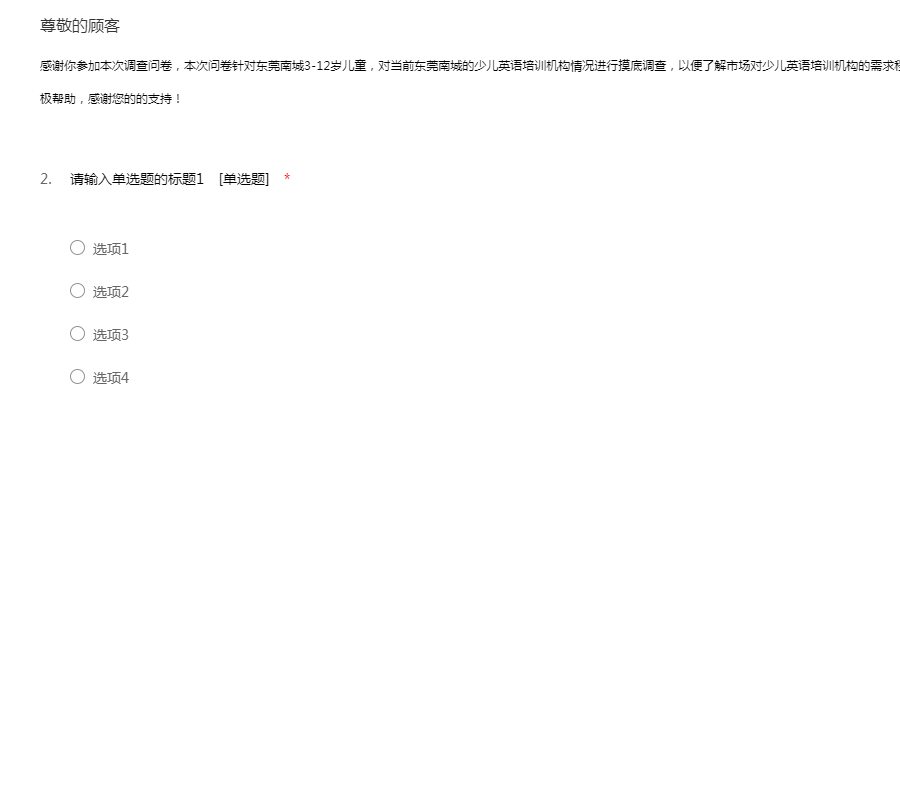 感谢你参加本次调查问卷,本次问卷针对东莞南城3-12岁儿童,对当前东莞南城的少儿英语培训机构情况进行摸底调查,以便了解市场对少儿英语培训机构的需求程度。这是我们的一次社会实践活动,请大家积极帮助,感谢您的的支持!