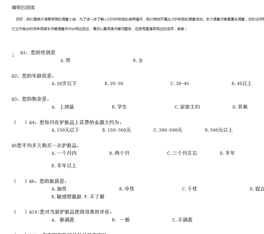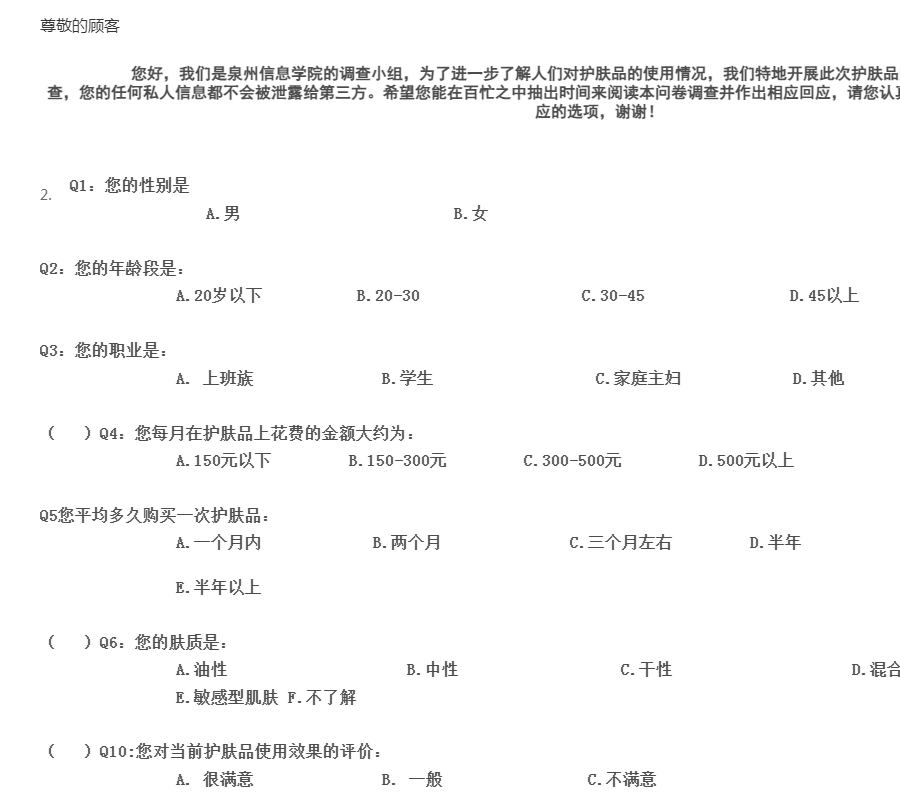 您好,我们是泉州信息学院的调查小组,为了进一步了解人们对护肤品的使用情况,我们特地开展此次护肤品的调查活动。本次调查问卷是匿名调查,您的任何私人信息都不会被泄露给第三方。希望您能在百忙之中抽出时间来阅读本问卷调查并作出相应回应,请您认真阅读问卷问题后,在括号里填写相应的选项,谢谢!