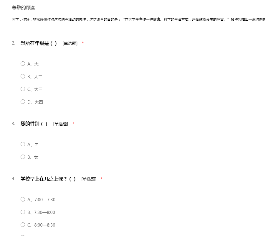 同学,你好,非常感谢你对这次调查活动的关注,这次调查的目的是:“向大学生宣传一种健康、科学的生活方式,远离熬夜带来的危害。”希望您抽出一点时间完成下列调查问题。