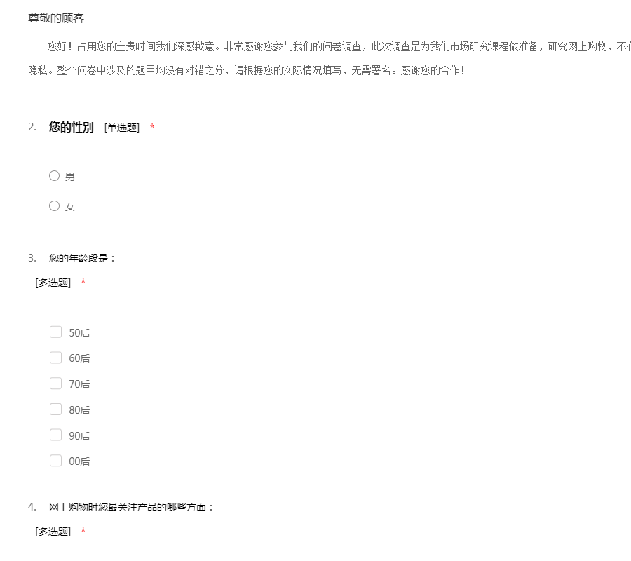 您好!占用您的宝贵时间我们深感歉意。非常感谢您参与我们的问卷调查,此次调查是为我们市场研究课程做准备,研究网上购物,不存在任何商业用途,更不会泄露您的任何隐私。整个问卷中涉及的题目均没有对错之分,请根据您的实际情况填写,无需署名。感谢您的合作!