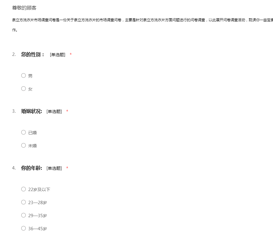 泉立方洗衣片市场调查问卷是一份关于泉立方洗衣片的市场调查问卷,主要是针对泉立方洗衣片方面问题进行的问卷调查,以此展开问卷调查活动,耽误你一些宝贵时间,回答泉立方洗衣片调查问卷,谢谢你的合作。