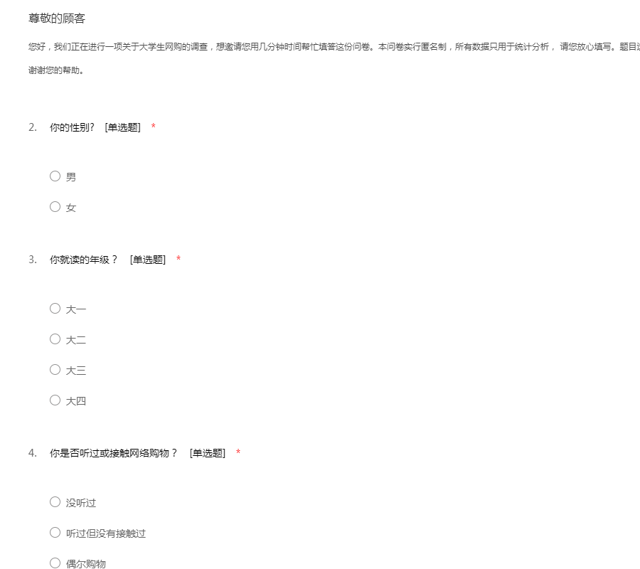 您好,我们正在进行一项关于大学生网购的调查,想邀请您用几分钟时间帮忙填答这份问卷。本问卷实行匿名制,所有数据只用于统计分析, 请您放心填写。题目选项无对错之分,请您按自己的实际情况填写。谢谢您的帮助。