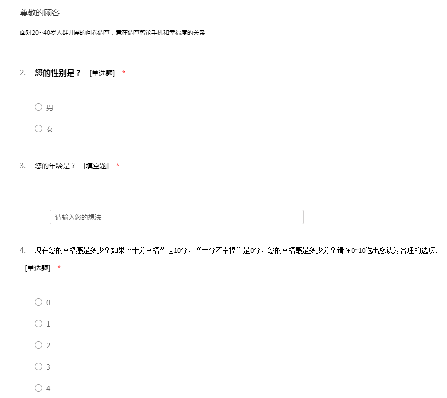 面对20~40岁人群开展的问卷调查,意在调查智能手机和幸福度的关系