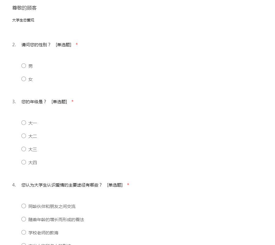 本次问卷调查意在了解当代大学生的恋爱实际情况,您的真实回答对我们来说十分宝贵!感谢您在百忙之中回答此卷!51调查网(我要调查网)谢谢您的参与。
