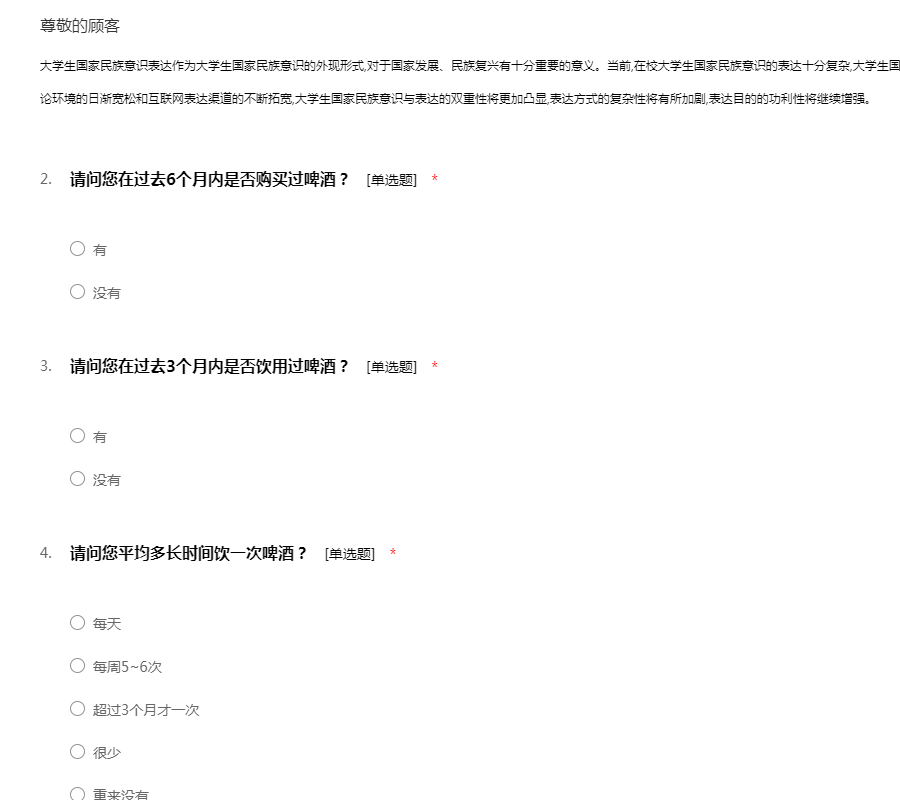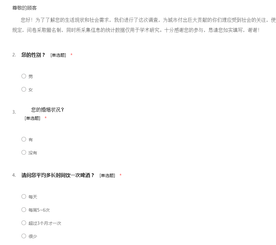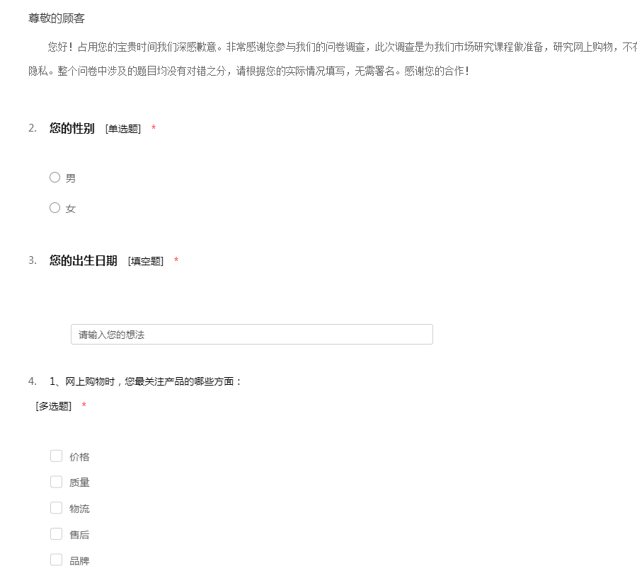 您好!占用您的宝贵时间我们深感歉意。非常感谢您参与我们的问卷调查,此次调查是为我们市场研究课程做准备,研究网上购物,不存在任何商业用途,更不会泄露您的任何隐私。整个问卷中涉及的题目均没有对错之分,请根据您的实际情况填写,无需署名。感谢您的合作!