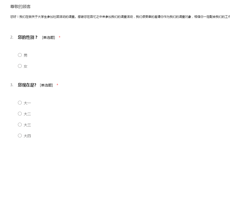 您好!我们在做关于大学生参加社团活动的调查。感谢您在百忙之中来参加我们的调查活动,我们很荣幸的邀请你作为我们的调查对象,相信你一定配合我们的工作,在此表示衷心感谢。