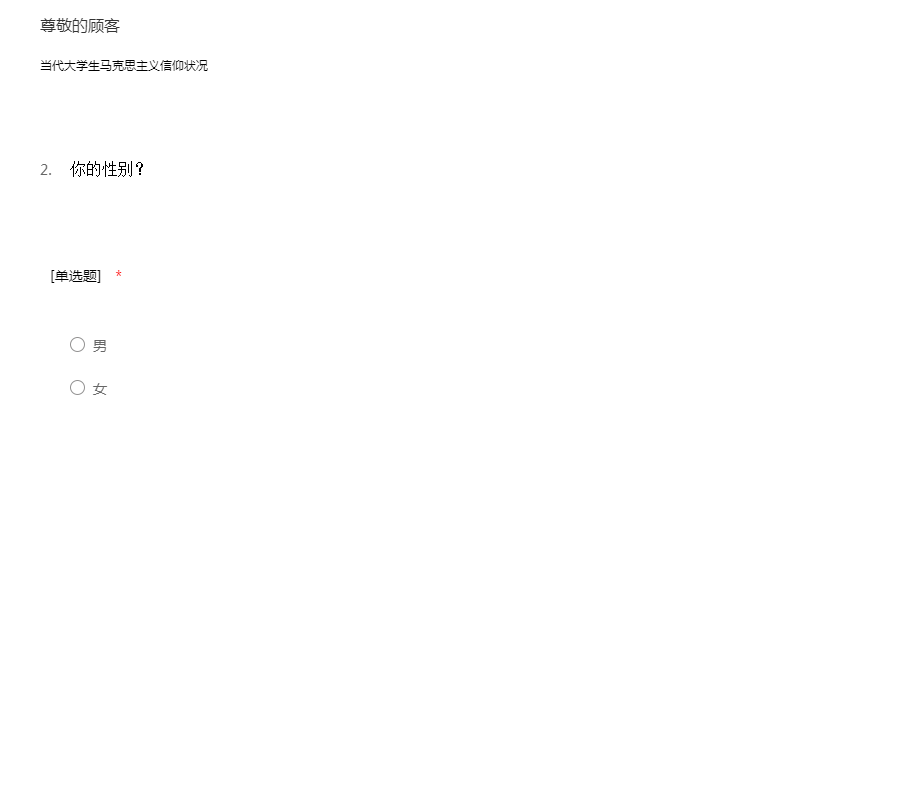 亲爱的同学:你好!为了更好地了解大家的恋爱观及恋爱状况,为大家现在或以后可能遇到的问题提供帮助,我们特设计此问卷。问卷所用数据均用于统计分析且为匿名调查,我们会保护你的隐私权,望如实回答。非常感谢你的支持。
