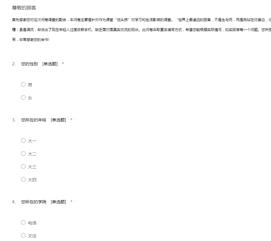 首先感谢您对这次问卷调查的配合,本问卷主要是针对作为课堂“低头族”对学习和生活影响的调查。“世界上最遥远的距离,不是生与死,而是我站在你身边,你却在玩手机。”这是网络上对于“低头族”的吐槽,虽是调侃,却说出了现在年轻人过度依赖手机、缺乏面对面真实交流的现状。此问卷采取匿名填写方式,希望您能根据实际情况,如实回答每一个问题。您所提供的所有的信息我们都将严格保密,请放心填写,非常感谢您的合作!
