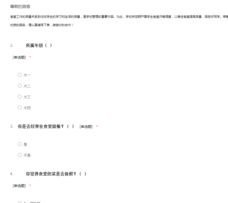食堂工作的质量关系到住校学生的学习和生活的质量,是学校管理的重要内容。为此,学校将定期开展学生食堂问卷调查,以推进食堂提高质量,服务好同学。亲爱的同学们,为了帮助我们改进工作,给您提供更优质的服务,请认真填写下表,谢谢你的合作!