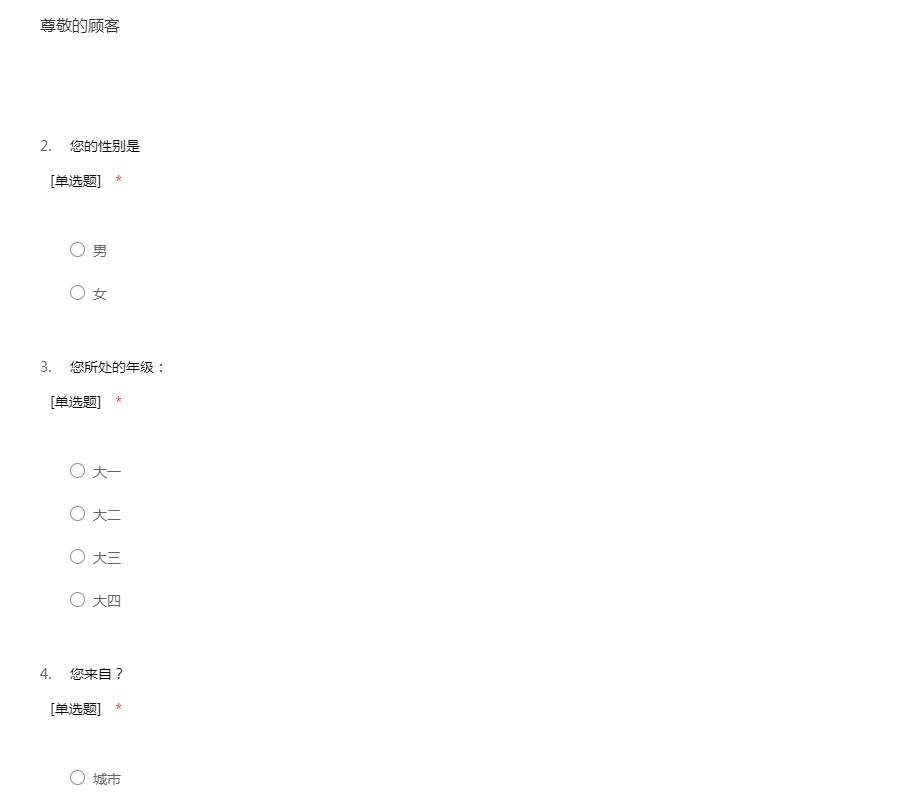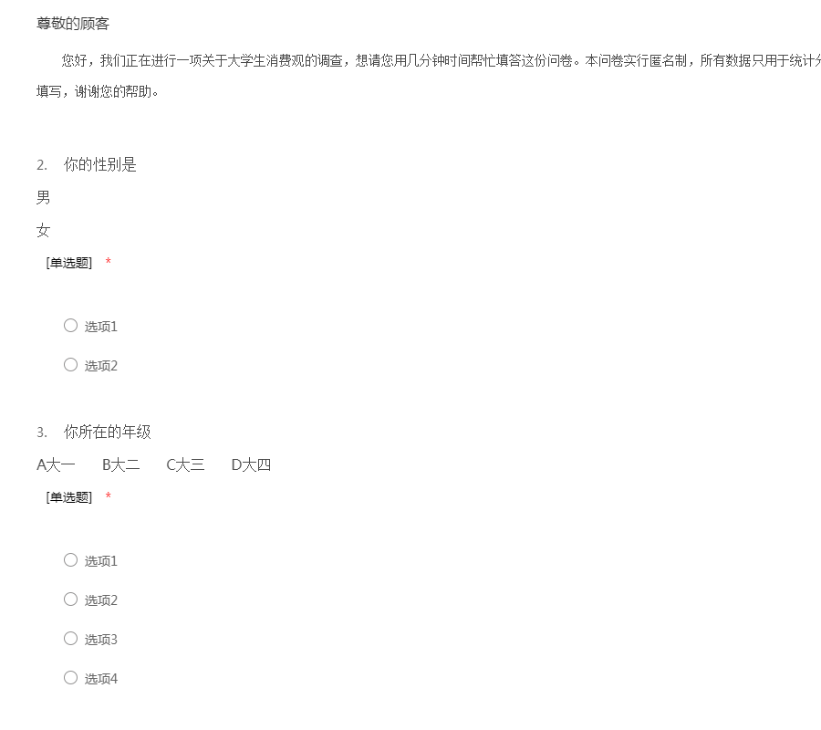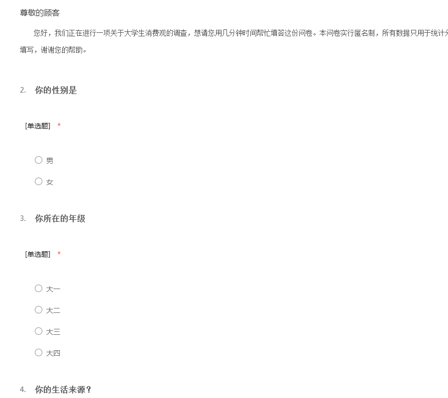 您好,我们正在进行一项关于大学生消费观的调查,想请您用几分钟时间帮忙填答这份问卷。本问卷实行匿名制,所有数据只用于统计分析, 请您放心填写,按自己的实际情况填写,谢谢您的帮助。