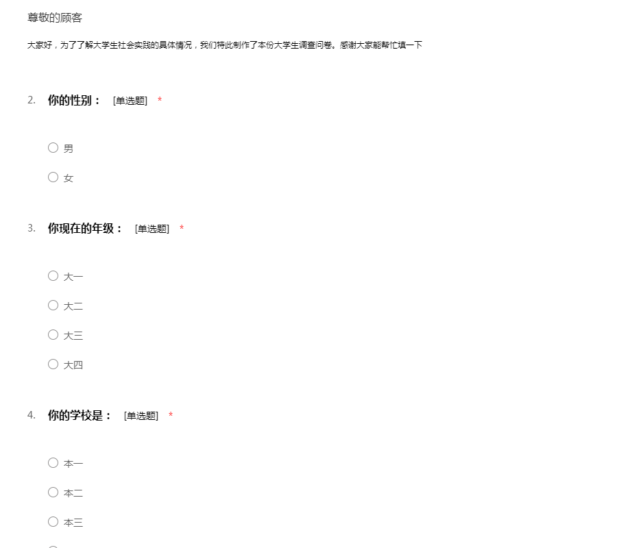 大家好,为了了解大学生社会实践的具体情况,我们特此制作了本份大学生调查问卷。感谢大家能帮忙填一下
