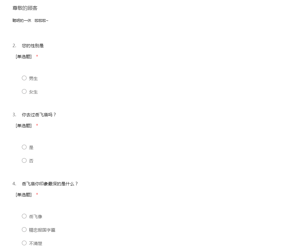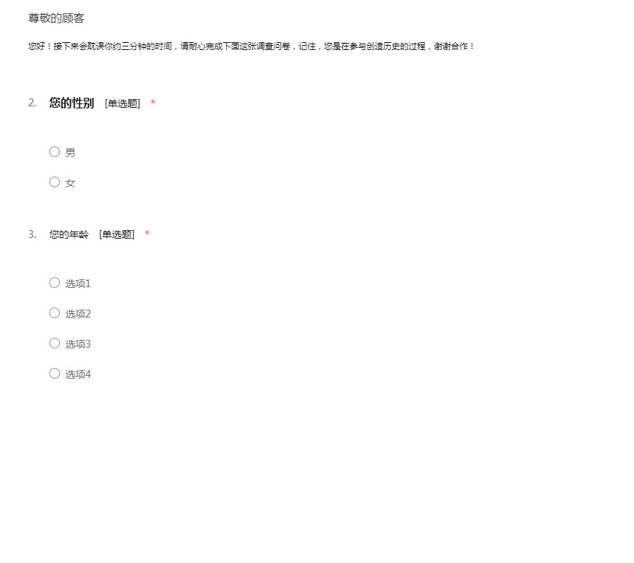 您好!接下来会耽误你约三分钟的时间,请耐心完成下面这张调查问卷,记住,您是在参与创造历史的过程,谢谢合作!