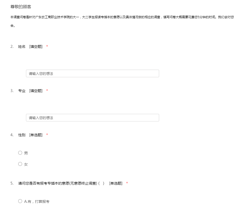 本调查问卷是针对广东农工商职业技术学院的大一,大二学生报读专插本的意愿以及具体情况做的相应的调查,填写问卷大概需要花费您5分钟的时间。我们会对您的信息保密,不会泄露您的个人信息,谢谢配合。