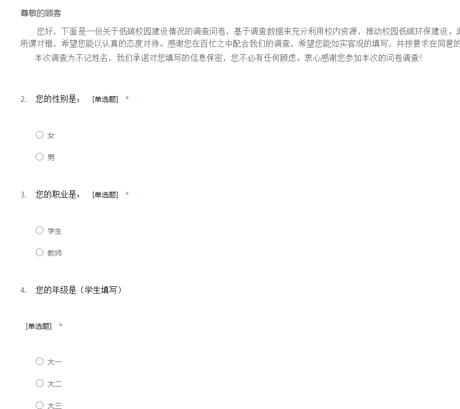 您好,下面是一份关于低碳校园建设情况的调查问卷,基于调查数据来充分利用校内资源,推动校园低碳环保建设。此次调查以不记名的方式进行,答案无所谓对错,希望您能以认真的态度对待。感谢您在百忙之中配合我们的调查,希望您能如实客观的填写,并按要求在同意的选项后打“√”。 本次调查为不记姓名,我们承诺对您填写的信息保密,您不必有任何顾虑。衷心感谢您参加本次的问卷调查!