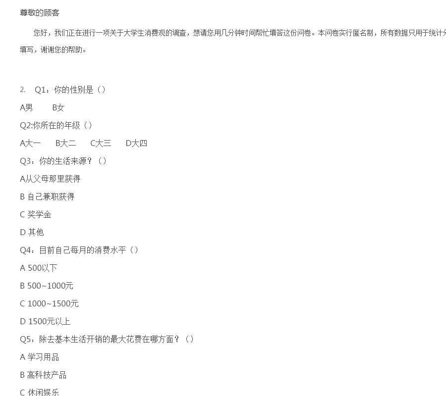 您好,我们正在进行一项关于大学生消费观的调查,想请您用几分钟时间帮忙填答这份问卷。本问卷实行匿名制,所有数据只用于统计分析, 请您放心填写,按自己的实际情况填写,谢谢您的帮助。