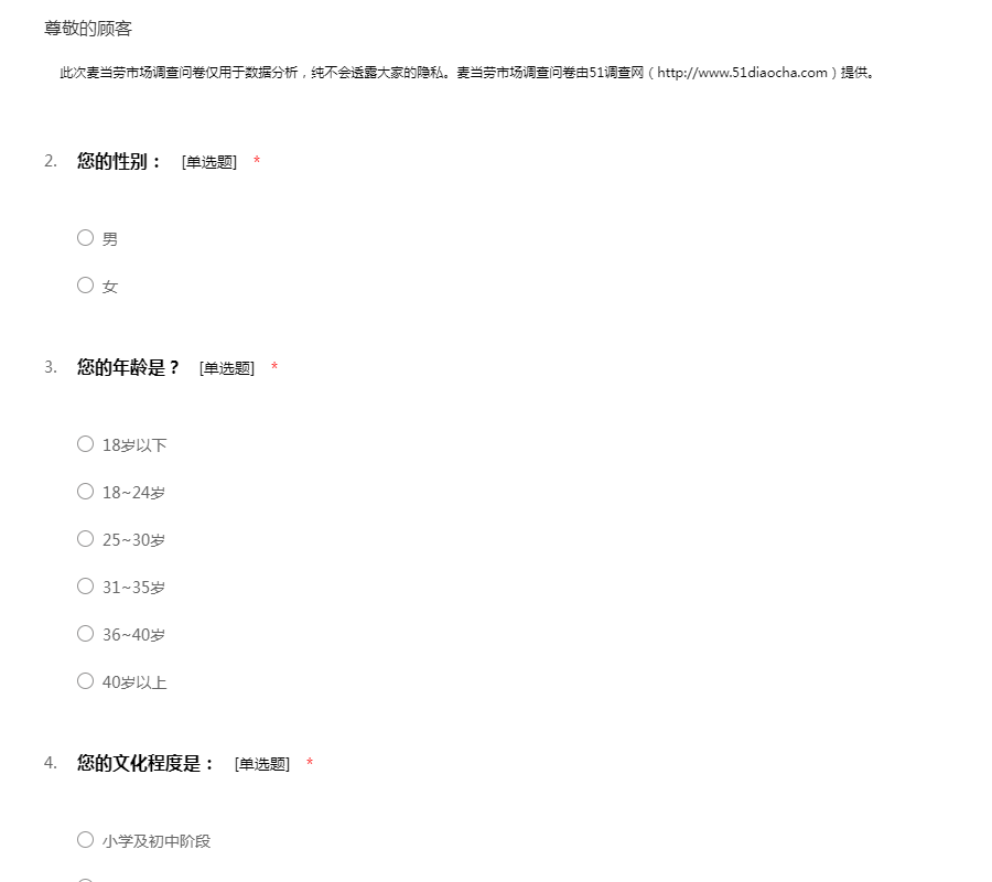 此次麦当劳市场调查问卷仅用于数据分析,纯不会透露大家的隐私。麦当劳市场调查问卷由51调查网(http://www.51diaocha.com)提供。
