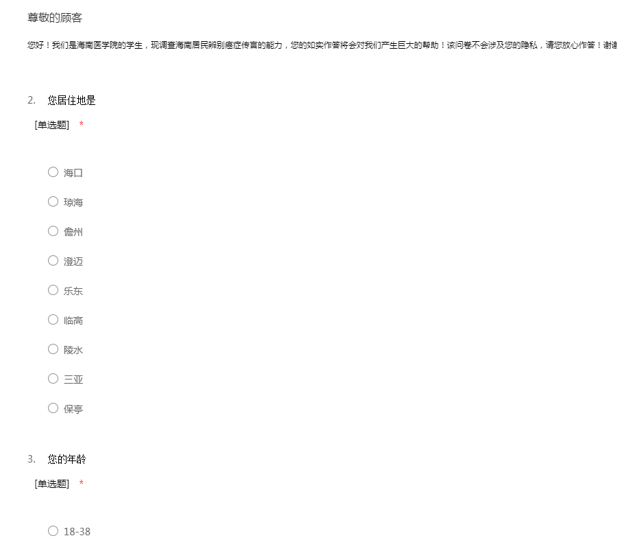 您好!我们是海南医学院的学生,现调查海南居民辨别癌症传言的能力,您的如实作答将会对我们产生巨大的帮助!该问卷不会涉及您的隐私,请您放心作答!谢谢!