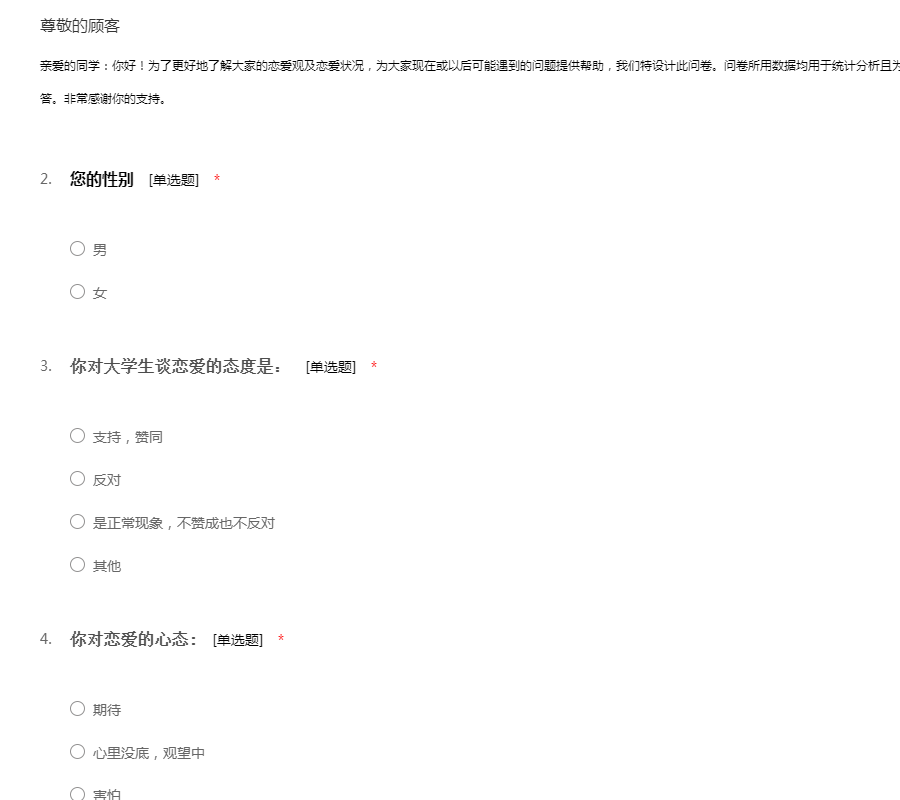 亲爱的同学:你好!为了更好地了解大家的恋爱观及恋爱状况,为大家现在或以后可能遇到的问题提供帮助,我们特设计此问卷。问卷所用数据均用于统计分析且为匿名调查,我们会保护你的隐私权,望如实回答。非常感谢你的支持。