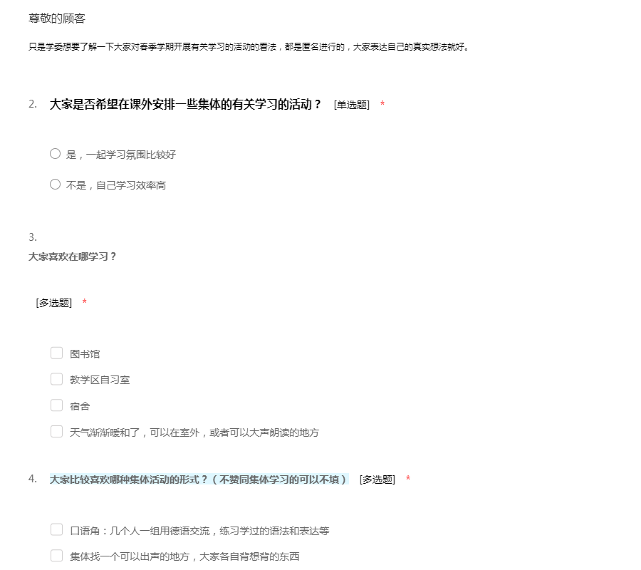 只是学委想要了解一下大家对春季学期开展有关学习的活动的看法,都是匿名进行的,大家表达自己的真实想法就好。