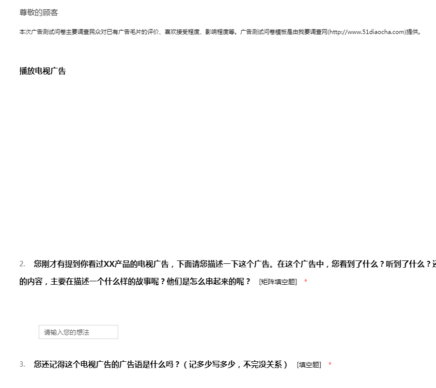 本次广告测试问卷主要调查民众对已有广告毛片的评价、喜欢接受程度、影响程度等。广告测试问卷模板是由我要调查网(http://www.51diaocha.com)提供。