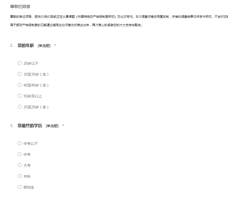 尊敬的各位领导、朋友们:我们目前正在从事课题《中国特色财产申报制度研究》及论文写作。本次调查问卷釆用匿名制,所有的调查结果仅供学术研究,不会对您的工作与生活产生任何影响,因此恳请您对于领导干部财产申报制度的见解通过填写此份问卷方式表达出来,再次衷心的感谢您的大力支持与配合。