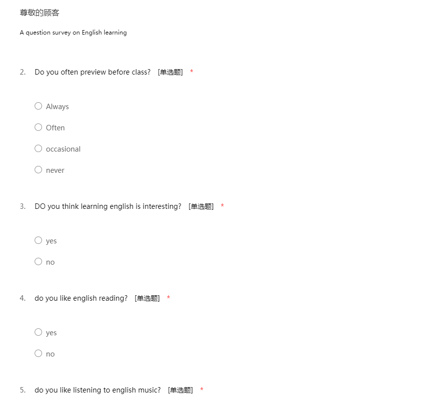 您好,我们是学生,我们做一次关于英语学习问卷调查,为了更好地了解学生学英语方面的情况,特展开此项调查问卷,望能予以支持并回答英语学习方面的问题。