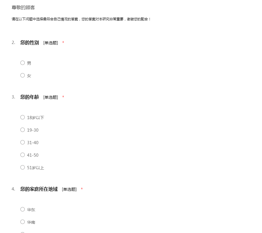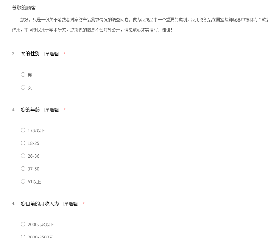 您好,只是一份关于消费者对家纺产品需求情况的调查问卷,做为家纺品中一个重要的类别,家用纺织品在居室装饰配套中被称为“软装饰,它在营造与环境转换中有着决定性作用,本问卷仅用于学术研究,您提供的信息不会对外公开,请您放心如实填写,谢谢!