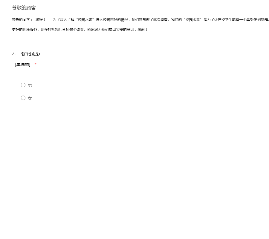 亲爱的同学: 您好! 为了深入了解“校园水果”进入校园市场的情况,我们特意做了此次调查。我们的“校园水果”是为了让在校学生能有一个享受吃到新鲜水果,以及了解水果的营养价值店铺,为了提供更好的优质服务,现在打扰您几分钟做个调查。感谢您为我们提出宝贵的意见,谢谢!