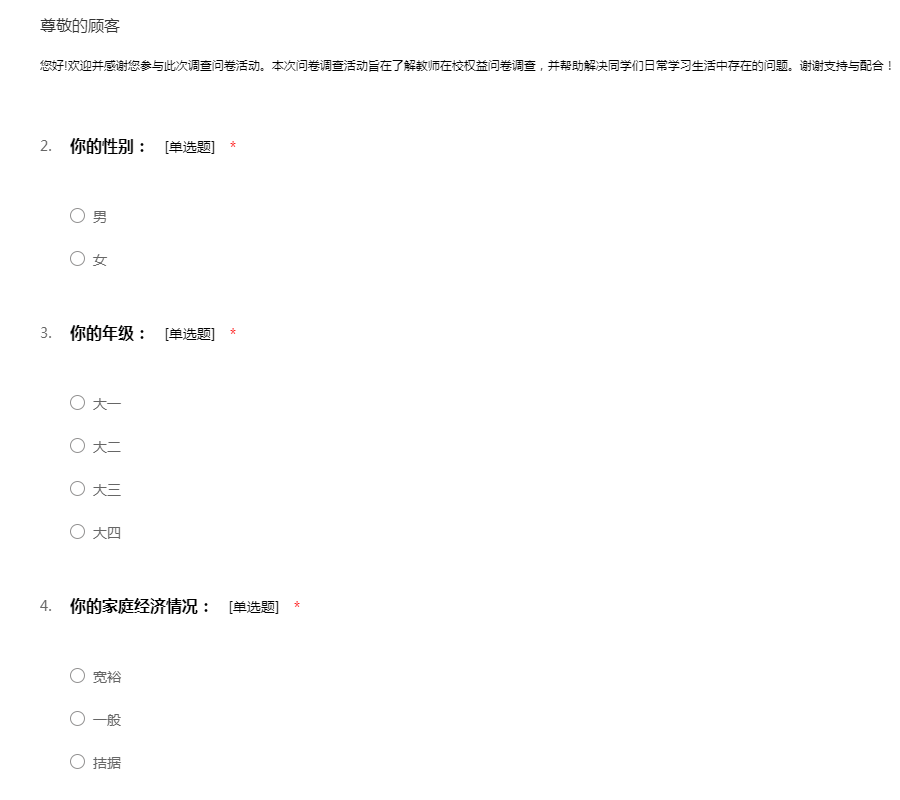 您好!欢迎并感谢您参与此次调查问卷活动。本次问卷调查活动旨在了解教师在校权益问卷调查,并帮助解决同学们日常学习生活中存在的问题。谢谢支持与配合!