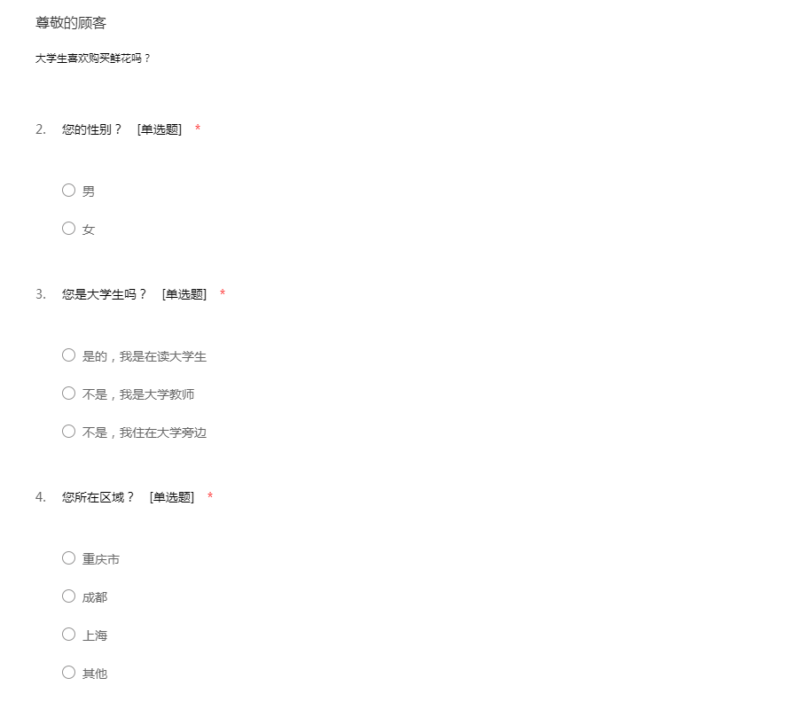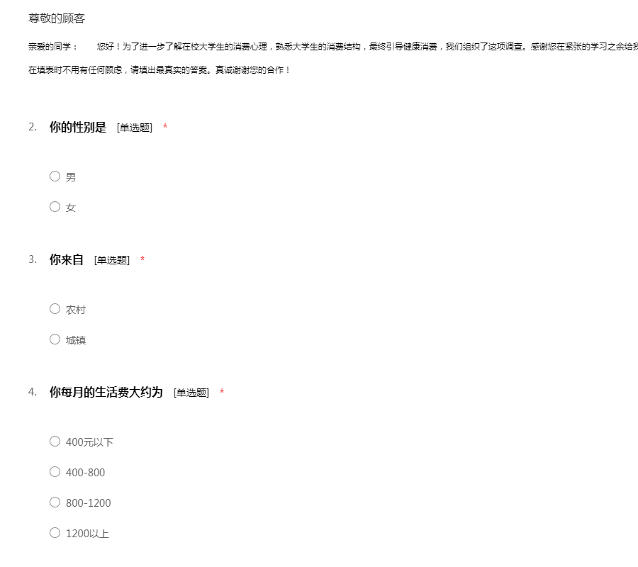 亲爱的同学: 您好!为了进一步了解在校大学生的消费心理,熟悉大学生的消费结构,最终引导健康消费,我们组织了这项调查。感谢您在紧张的学习之余给我们提供宝贵的信息与意见。此调查不记姓名,您在填表时不用有任何顾虑,请填出最真实的答案。真诚谢谢您的合作!