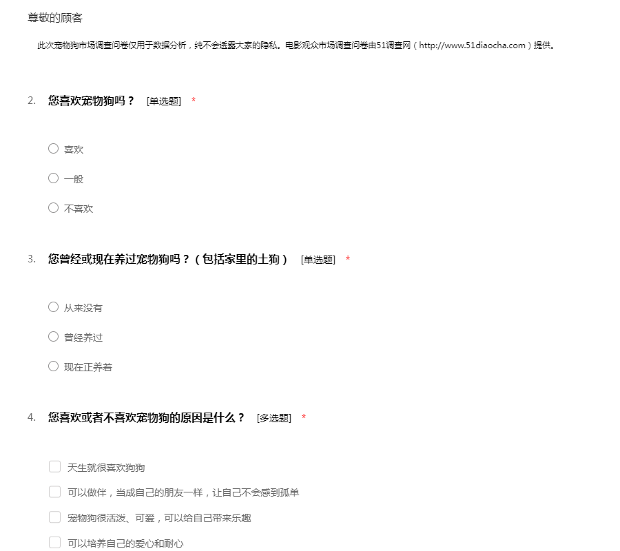 此次宠物狗市场调查问卷仅用于数据分析,纯不会透露大家的隐私。电影观众市场调查问卷由51调查网(http://www.51diaocha.com)提供。