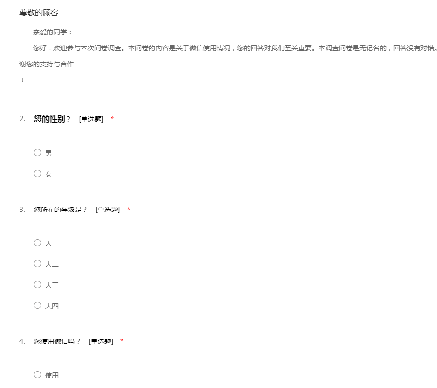 亲爱的同学: 您好!欢迎参与本次问卷调查。本问卷的内容是关于微信使用情况,您的回答对我们至关重要。本调查问卷是无记名的,回答没有对错之分,请放心填写,大约占用您2分钟,谢谢您的支持与合作!
