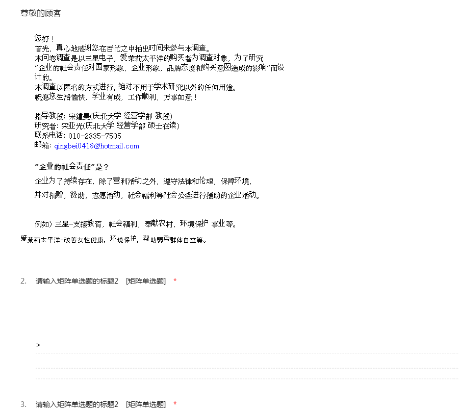 您好!首先,真心地感谢您在百忙之中抽出时间来参与本调查。本问卷调查是以三星电子,爱茉莉太平洋的购买者为调查对象,为了研究“企业的社会责任对国家形象,企业形象,品牌态度和购买意图造成的影响”而设计的。本调查以匿名的方式进行, 绝对不用于学术研究以外的任何用途。祝愿您生活愉快,学业有成,工作顺利,万事如意! 指导教授: 宋鍾昊(庆北大学 经营学部 教授)研究者: 宋亚光(庆北大学 经营学部 硕士在读)联系电话: 010-2835-7505