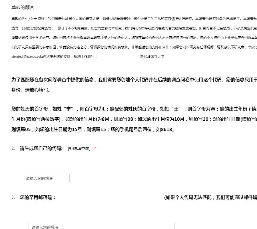 尊敬的先生/女士,您好,我们是新加坡国立大学的研究人员,拟通过问卷调查对中国企业员工的工作和家庭情况进行研究。本调查的研究对象为已婚员工。本调查包括六份问卷(4份由您填写,1份由您的一位同事填写,1份由您的配偶填写),预计于4-6周内完成。如您同意参与本研究,我们将分6次将纸质问卷或问卷的链接发放给您。所有问卷不记名填写,不涉及商业机密,并严格按照《统计法》的有关规定进行保密,调查结果仅用于学术研究。您的回答将不会被透露给本研究小组之外的任何人,您所在单位的任何人不会获取您填写的信息。您的个人资料也不会出现在任何跟本调查相关的报告中。请您放心填写。您的回答对我们的研究具有重要的参考价值,答案没有对错之分,请根据您的情况如实填答。非常感谢您的支持和合作!如果您对本研究有任何疑问,请联系以下研究者。李欣欣 新加坡国立大学商学院邮箱:xinxin.li@u.nus.edu再次感谢您的支持,祝您工作顺利! 新加坡国立大学