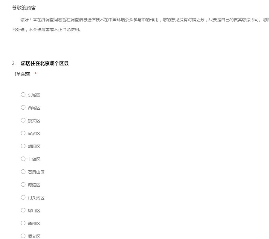 您好!本在线调查问卷旨在调查信息通信技术在推动中国环境公众参与中的作用,主要考察公众对可持续发展的了解和行动,公众参与环境保护和可持续发展的情况、ICT技术在推动可持续公众参与方面的应用,期望能通过您的建议,推动中国公众参与可持续发展。您的意见没有对错之分,只要是自己的真实想法即可。您所提供的信息和数据将仅用于研究并会匿名处理,不会被泄露或不正当地使用。公众参与:就是公民试图影响公共环境政策和公共生活的一切活动,它包括:投票、竞选、公决、结社、请愿、集会、抗议、游行、示威、反抗、宣传、动员、串联、检举、对话、辩论、协商、游说、听证、上访等等。
