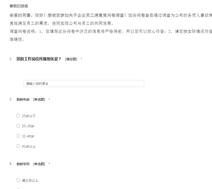 亲爱的同事,你好!感谢您参加关于企业员工满意度问卷调查!这份问卷旨在通过调查为公司的各项人事政策的制定提供依据,最终能更大程度地满足员工的需求,进而实现公司与员工的共同发展。 调查问卷说明:1、您填写此份问卷中涉及的信息将严格保密,所以您可以放心作答;2、请您按实际情况作答,否则将有可能影响调查结果的准确性。