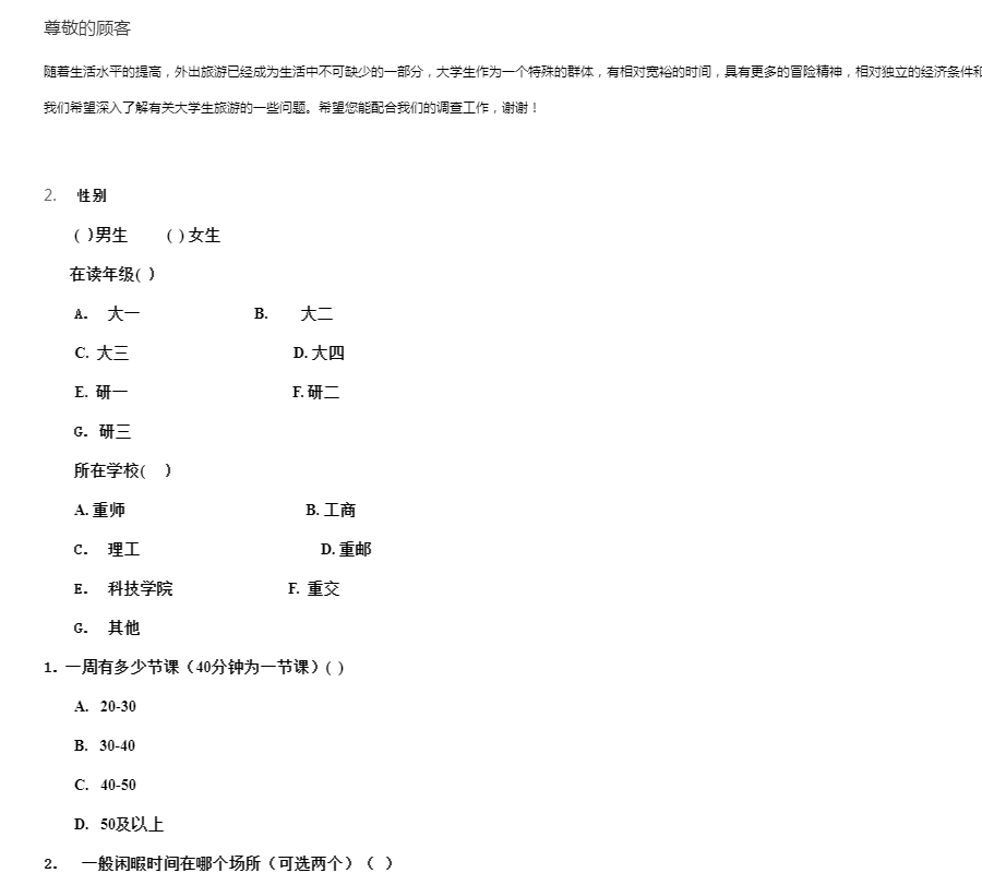 随着生活水平的提高,外出旅游已经成为生活中不可缺少的一部分,大学生作为一个特殊的群体,有相对宽裕的时间,具有更多的冒险精神,相对独立的经济条件和生活能力,因此促成了一股大学生旅游热。为此我们希望深入了解有关大学生旅游的一些问题。希望您能配合我们的调查工作,谢谢!