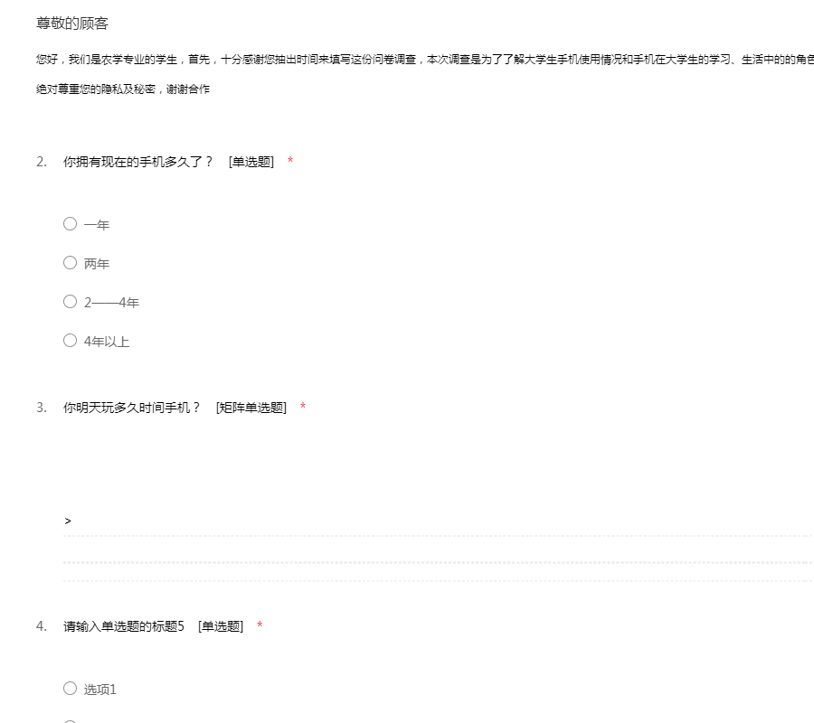 您好,我们是农学专业的学生,首先,十分感谢您抽出时间来填写这份问卷调查,本次调查是为了了解大学生手机使用情况和手机在大学生的学习、生活中的的角色。问卷采用不记名的形式,请如实填写,我们会绝对尊重您的隐私及秘密,谢谢合作