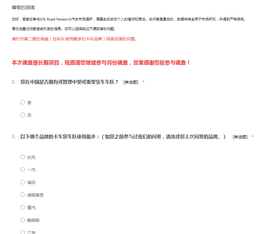 您好,感谢您的参与Silk Road Research商用车市场调研。请真实反映您个人的想法。 该问卷是匿名的,数据将完全用于市场研究,并得到严格保密。请勿泄露任何敏感或机密的信息。您可以选择跳过不便回答的问题。 请针对第二题的答案(哪个品牌占您销量最多)回答后面的问题。