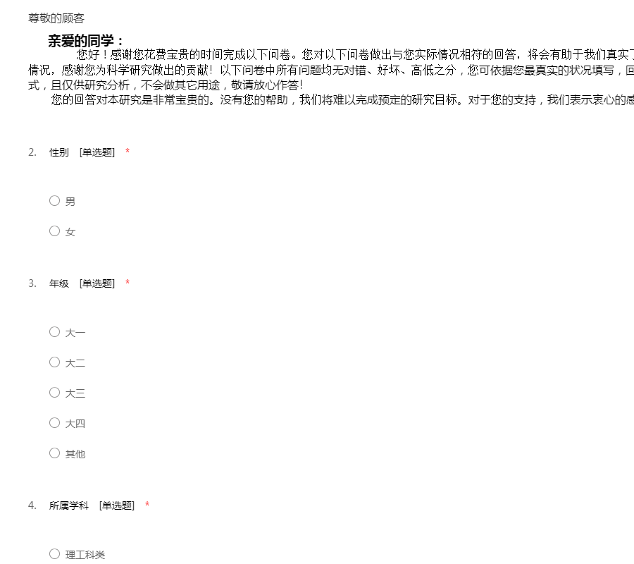 亲爱的同学: 您好!感谢您花费宝贵的时间完成以下问卷。您对以下问卷做出与您实际情况相符的回答,将会有助于我们真实了解有关当代大学生在线学习的重要情况,感谢您为科学研究做出的贡献!以下问卷中所有问题均无对错、好坏、高低之分,您可依据您最真实的状况填写,回答结果保密。问卷采取无记名方式,且仅供研究分析,不会做其它用途,敬请放心作答!您的回答对本研究是非常宝贵的。没有您的帮助,我们将难以完成预定的研究目标。对于您的支持,我们表示衷心的感谢!