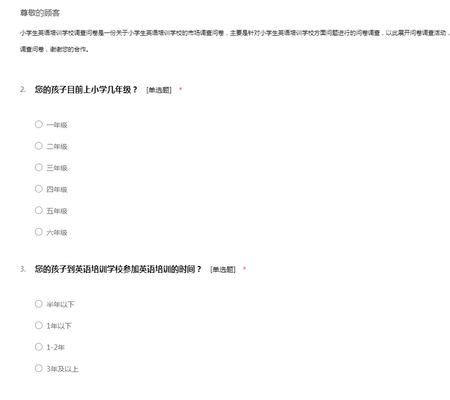 小学生英语培训学校调查问卷是一份关于小学生英语培训学校的市场调查问卷,主要是针对小学生英语培训学校方面问题进行的问卷调查,以此展开问卷调查活动,耽误您一些宝贵时间,回答小学生英语培训学校调查问卷,谢谢您的合作。