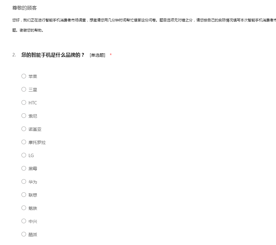 您好,我们正在进行智能手机消费者市场调查,想邀请您用几分钟时间帮忙填答这份问卷。题目选项无对错之分,请您按自己的实际情况填写本次智能手机消费者市场调查,主要是了解智能手机市场等方面的问题。谢谢您的帮助。