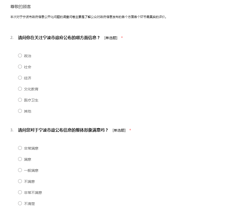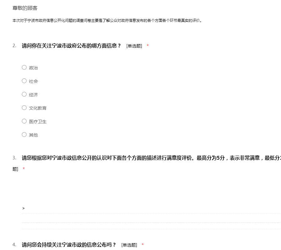 本次对于宁波市政府信息公开化问题的调查问卷主要是了解公众对政府信息发布的各个方面各个环节最真实的评价。