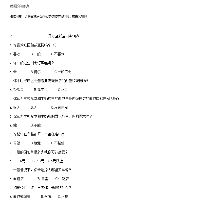 通过问卷,了解蛋糕店在我们学校的市场如何,前景又如何