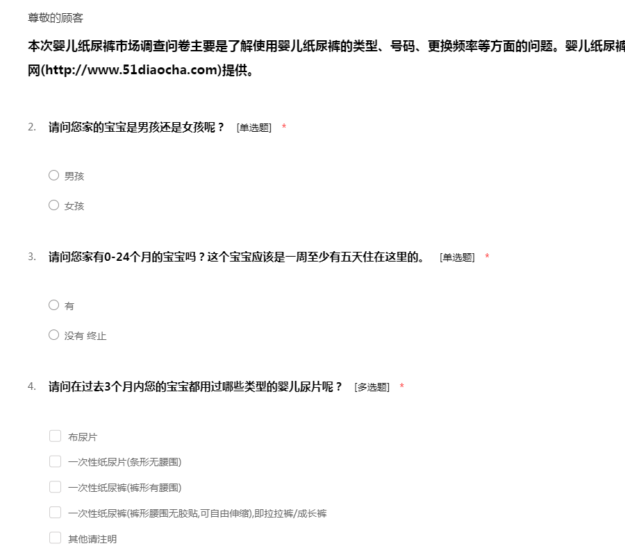 本次婴儿纸尿裤市场调查问卷主要是了解使用婴儿纸尿裤的类型、号码、更换频率等方面的问题。婴儿纸尿裤市场调查问卷模板是由我要调查网(http://www.51diaocha.com)提供。