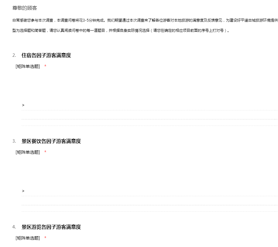 非常感谢您参与本次调查,本调查问卷将花3-5分钟完成。我们期望通过本次调查来了解各位游客对本地旅游的满意度及反馈意见,为建设好平遥古城旅游环境提供一定的参考。本次调查采取不记名方式进行,题型为选择题和简答题,请您认真阅读问卷中的每一道题目,并根据自身实际情况选择(请您在确定的相应项目前面的序号上打对号)。