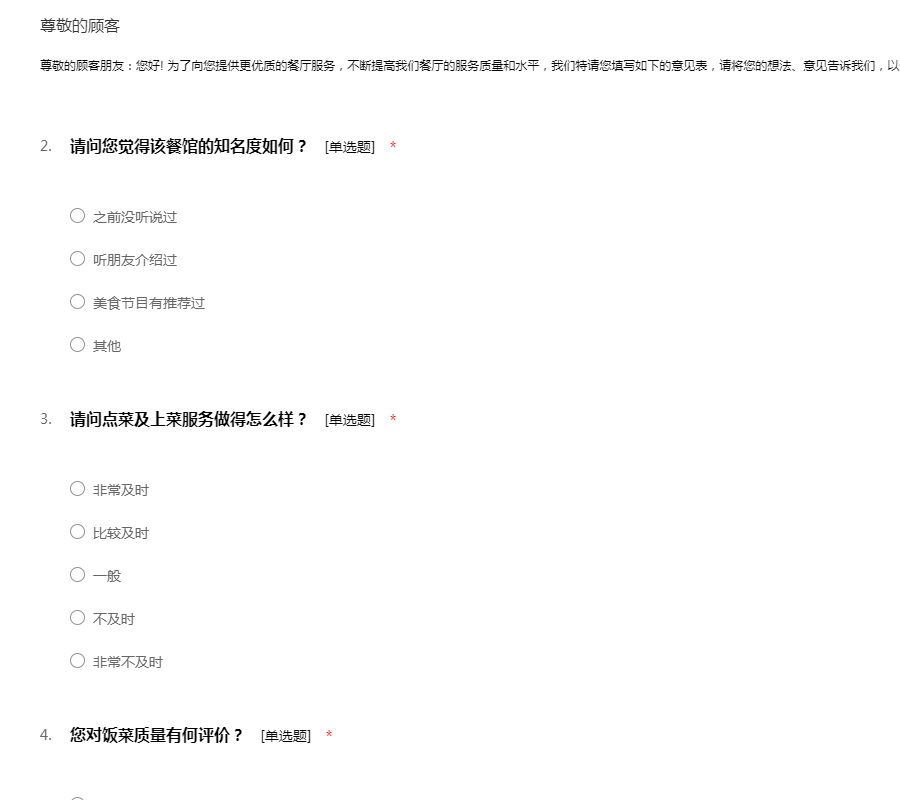 尊敬的顾客朋友:您好! 为了向您提供更优质的餐厅服务,不断提高我们餐厅的服务质量和水平,我们特请您填写如下的意见表,请将您的想法、意见告诉我们,以便让我们做得更好。谢谢您的支持!